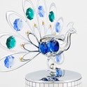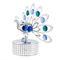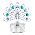 SWAROVSKI® CRYSTALS — This Peacock Music Box is accented with Swarovski® Crystals - Registered Trademarks of Swarovski AG. In sunlight, these 40 facet cut Swarovski crystals refract colors, creating a vibrant and eye-catching atmosphere to your office, bedroom, or kitchen. Crystal colors are in Emerald, Blue, Dark Blue, and Gold.
