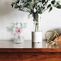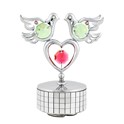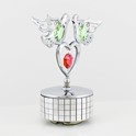 SWAROVSKI® CRYSTALS — This Doves & Heart music box is accented with Swarovski® Crystals - Registered Trademarks of Swarovski AG. In sunlight, these 40 facet cut Swarovski crystals refract colors, creating a vibrant and eye-catching atmosphere to your office, bedroom, or kitchen. Crystal colors are in Light Peridot, red, and pale pink.