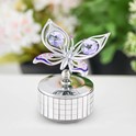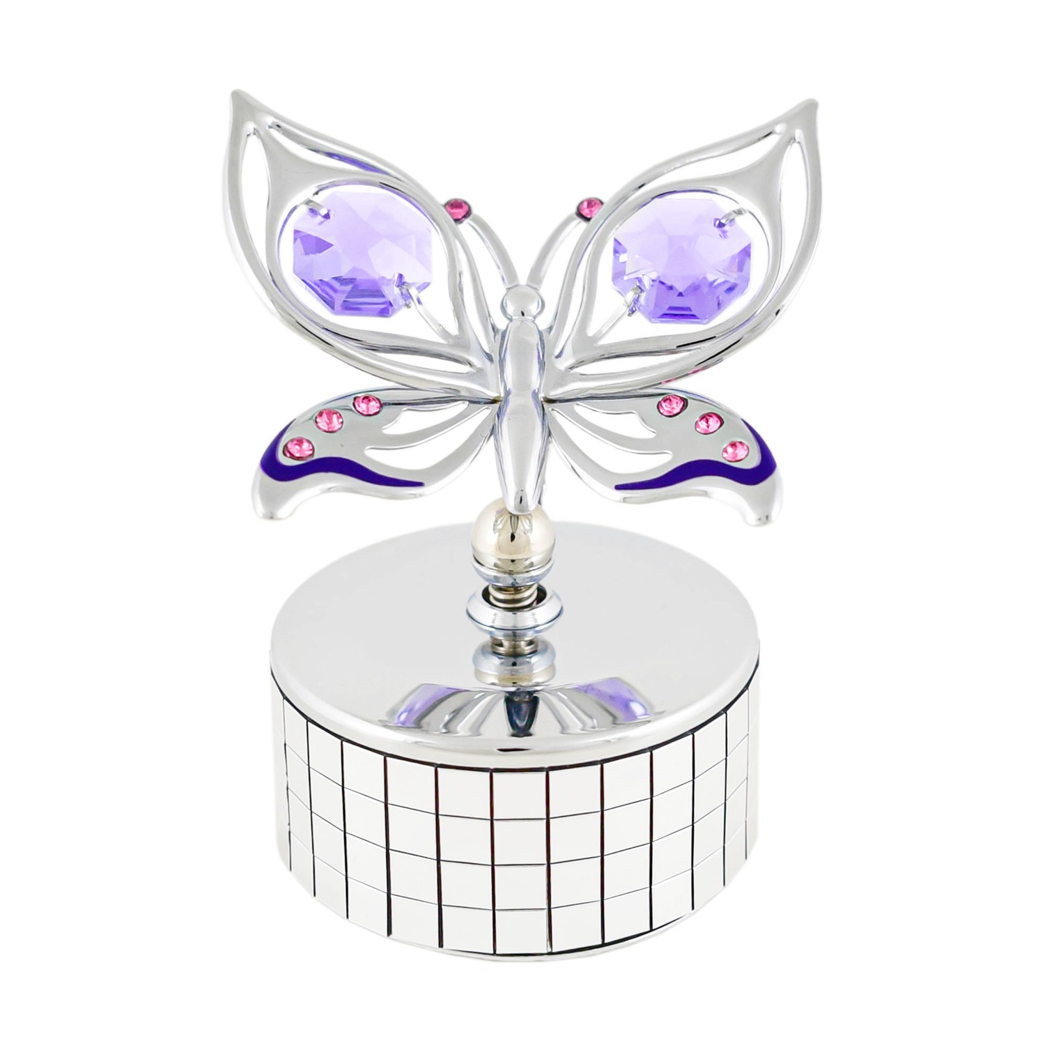 SWAROVSKI® CRYSTALS — This Orchid Butterfly Mirror Music Box is accented with Swarovski® Crystals - Registered Trademarks of Swarovski AG. In sunlight, these 40 facet cut Swarovski crystals refract colors, creating a vibrant and eye-catching atmosphere to your office, bedroom, or kitchen. Crystal colors are in pink and violet.