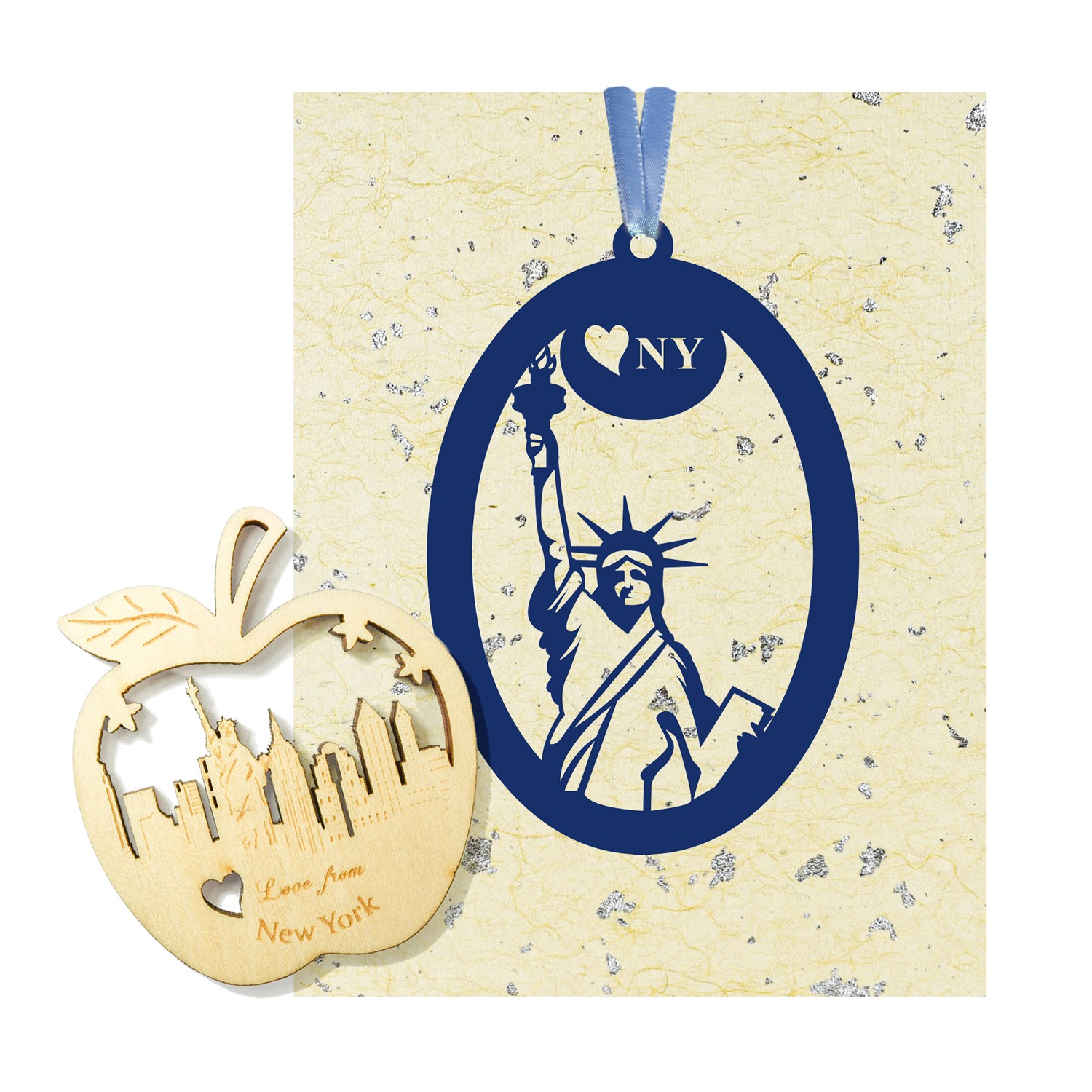 Gift Card Package includes: NYC Paper Ornament/Bookmark w/ Ribbon, Xuan Gold Speck Paper, Xuan Fiber Paper, Wooden Big Apple Ornament and envelope