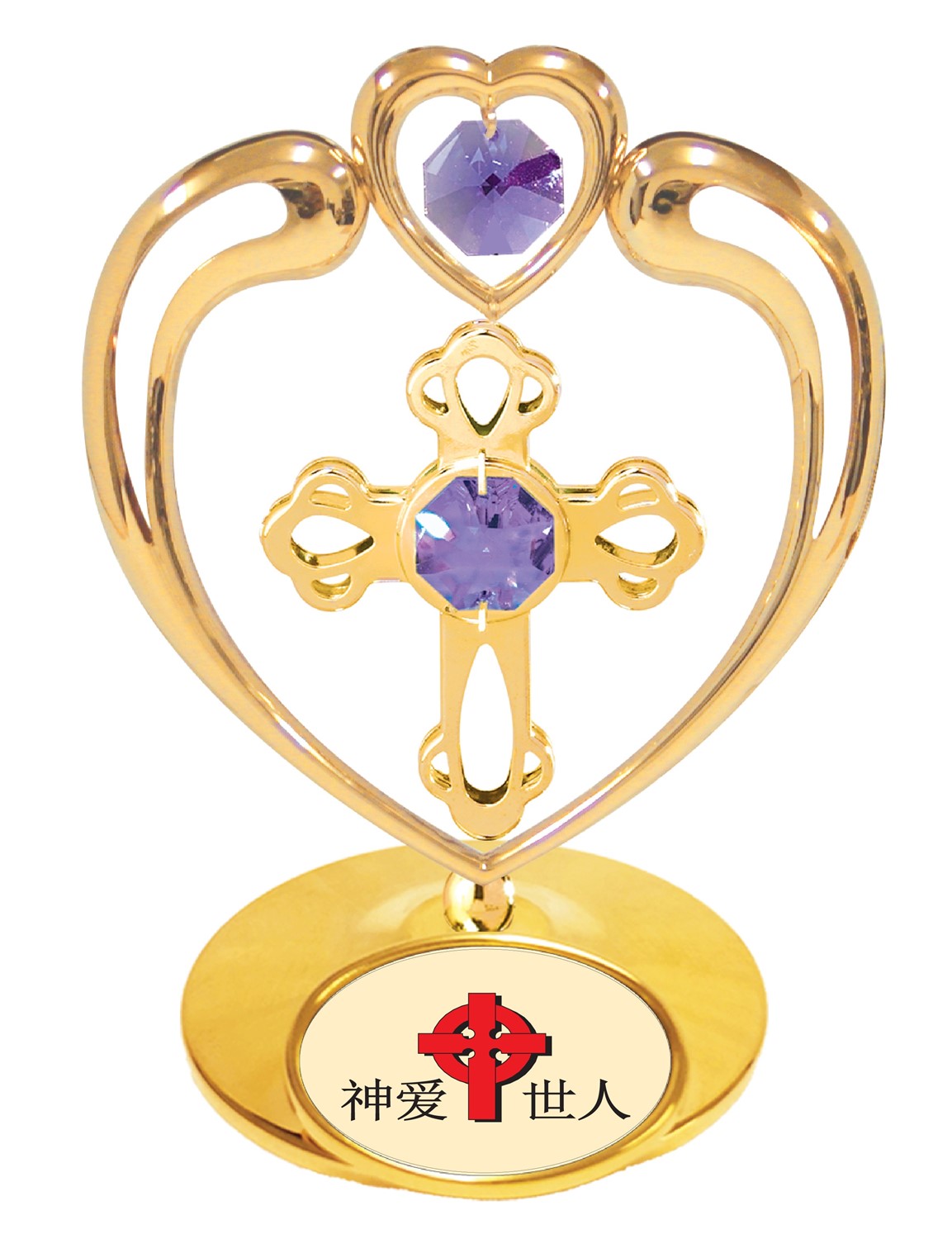 24K GOLD PLATED CROSS IN HEART ON STAND with LOGO